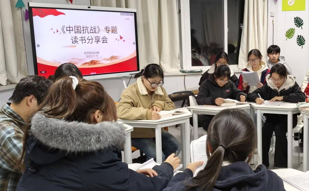时间:2025-11-25 预审:杨子芃 二审:李娜 终审:李娜 来源:药学院 阅读次数:烽火映初心,书香传精神。为缅怀革命先烈、传承红色基因,11月19日,药学院在9号宿舍楼一站式学生社区开展了一场主题鲜明、内涵丰富的《中国抗战》读书分享会。年级辅导员唐保露、王琪及2025级新生参加,师生齐聚一堂,共同重温那段波澜壮阔的抗战岁月。