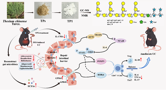 溃疡性结肠炎(UC)是一种慢性且复杂的炎症性疾病,檀香科植物“百蕊草”因其抗菌、抗炎、镇咳和镇痛特性而为人所知,本研究从十大皖药“百蕊草”中提取得到一种名为TP1的新型中性均质杂多糖,分子量为5377Da。结构解析证实TP1主要由果糖、葡萄糖、半乳糖组成,TP1主链主要由→1)-β-D-Fruf-(2→、→1,6)-β-D-Fruf-(2→、→4)-α-D-Glcp-(1→和→3,6)-β-D-Galp-(1→组成,侧链Fruf-(2→6)-β-D-Fruf-(2→连接在→1,6)-β-D-Fruf-(2→的C-6位,β-D-Galp-(1→连接在→3,6)-β-D-Galp-(1→的C-6位。通过葡聚糖硫酸钠(DSS)诱导小鼠结肠炎模型并给予TP1干预,发现TP1明显改善UC症状,修复肠道黏膜屏障损伤。多组学研究证实TP1重塑肠道菌群,增加SCFAs的浓度,激活GPR41/43受体,显著下调IL-17/NF-κB/JAK2/STAT3信号轴蛋白的表达,推测TP1可能通过SCFAs介导的GPR41/43信号通路与IL-17/NF-κB/JAK2/STAT3信号通路两条途径来维持Th17/Treg稳态从而调节IL-17、IL-6、TNF-a、IL-10的分泌来缓解UC。本研究为十大皖药 “百蕊草”的深度开发提供了理论依据与数据支撑。(胡广东/文、图)